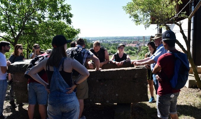 Der letzte Teil der Exkursion fand dann in verminderter Gruppenstärke auf dem Kästenberg in Bad Dürkheim statt, wo wir zur Höhensiedlung „Heidenmauer“, einem 2 km langen keltischen Ringwall der Späthallstattzeit, und ihrem freigelegtem Zangentor wanderten. Zum Abschluss stiegen wir zum römischen Steinbruch, dem sog. Kriemhildenstuhl. Dort gab es dann mit phantastischer Aussicht auf die Weinstraße und in die Rheinebene eine Feierabendschorle, bevor wir uns nach einem langen und sehr interessanten Tag auf den Rückweg nach Mainz machten.