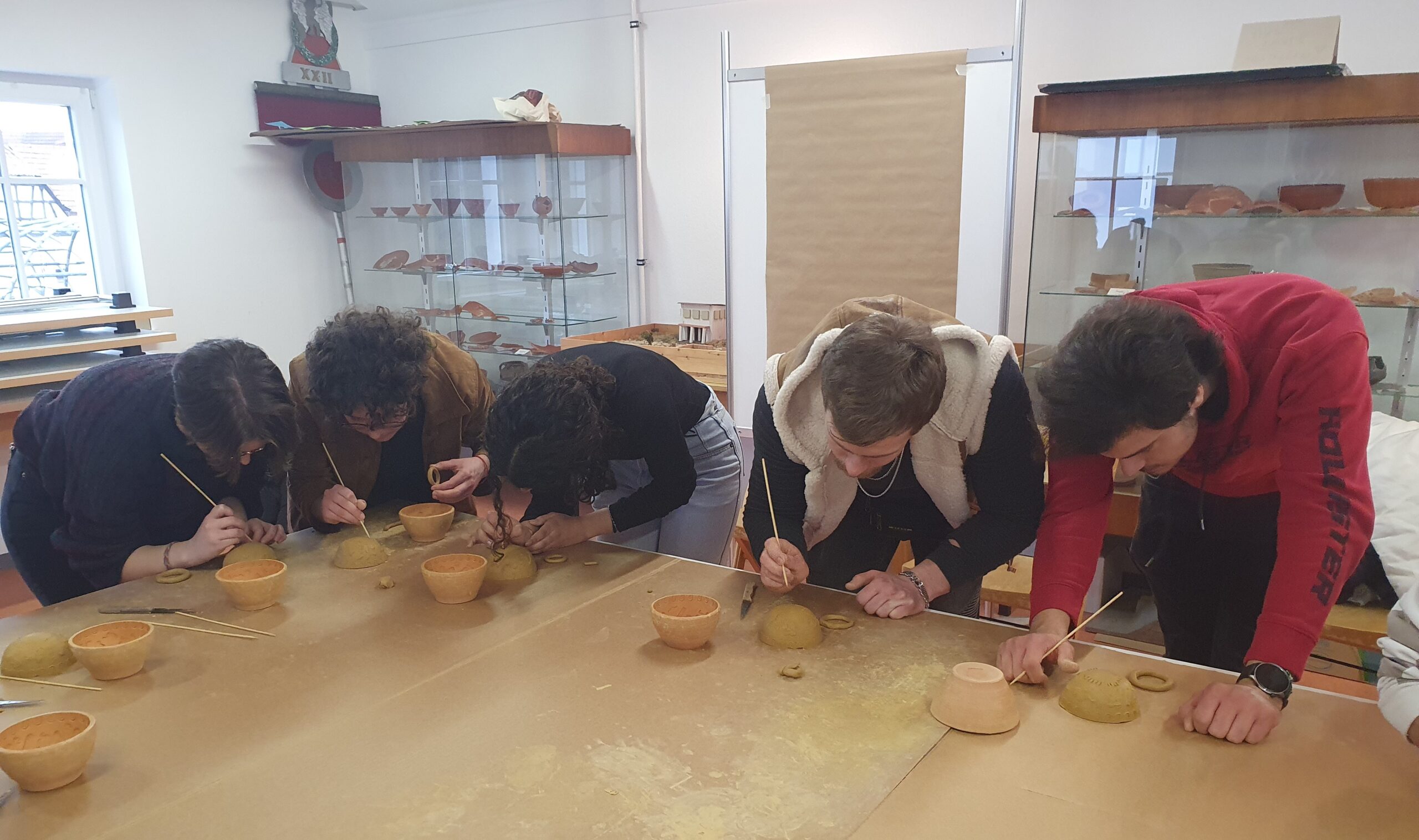 Anhand der beiden dort noch in situ befindlichen monumentalen Ziegel- und Sigillataöfen konnten wir nicht nur deren Aufbau, sondern auch die unterschiedlichen Brennprozesse der Keramikherstellung besprechen. Zurück im Museum verinnerlichten wir auch die unterschiedlichen Dekorationstechniken der Terra Sigillata an den Exponaten und Repliken, die zur besseren Autopsie herumgegeben wurden. Vertiefend besprachen wir weiterhin anhand der Ausstellungsstücke grundlegende Fragen zur Terra Sigillata wie deren Formen- und Dekorationsvielfalt, ihre Bilderwelt, aber auch wirtschafts- und handelsgeschichtliche Fragen.